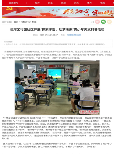 7月23日,beat365英国官网网站“行知学堂”小先生们来到了包河区烟墩街道竹园社区,组织开展了“探索宇宙,助梦未来”天文科普活动,向社区青少年传授有关宇宙科学知识,丰富暑期生活,激发和提高孩子们对宇宙探索的兴趣。