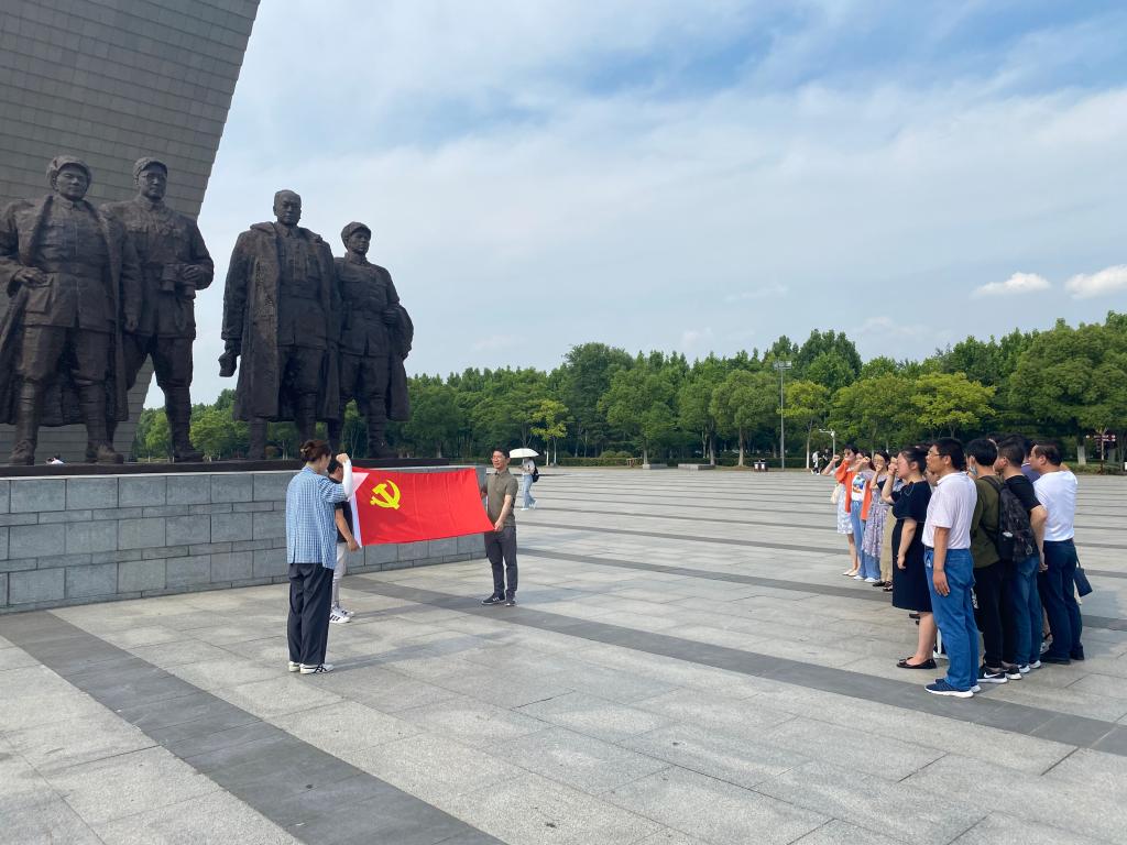 在渡江战役纪念馆广场“五前委”雕像前,全体党员一起高举右手,面对鲜红的党旗,再次庄严宣誓。铿锵恢宏的誓词,神圣而豪迈,铮铮誓言,体现了党员们对中国共产党的无限忠诚,坚定了入党使命、奋斗初心。