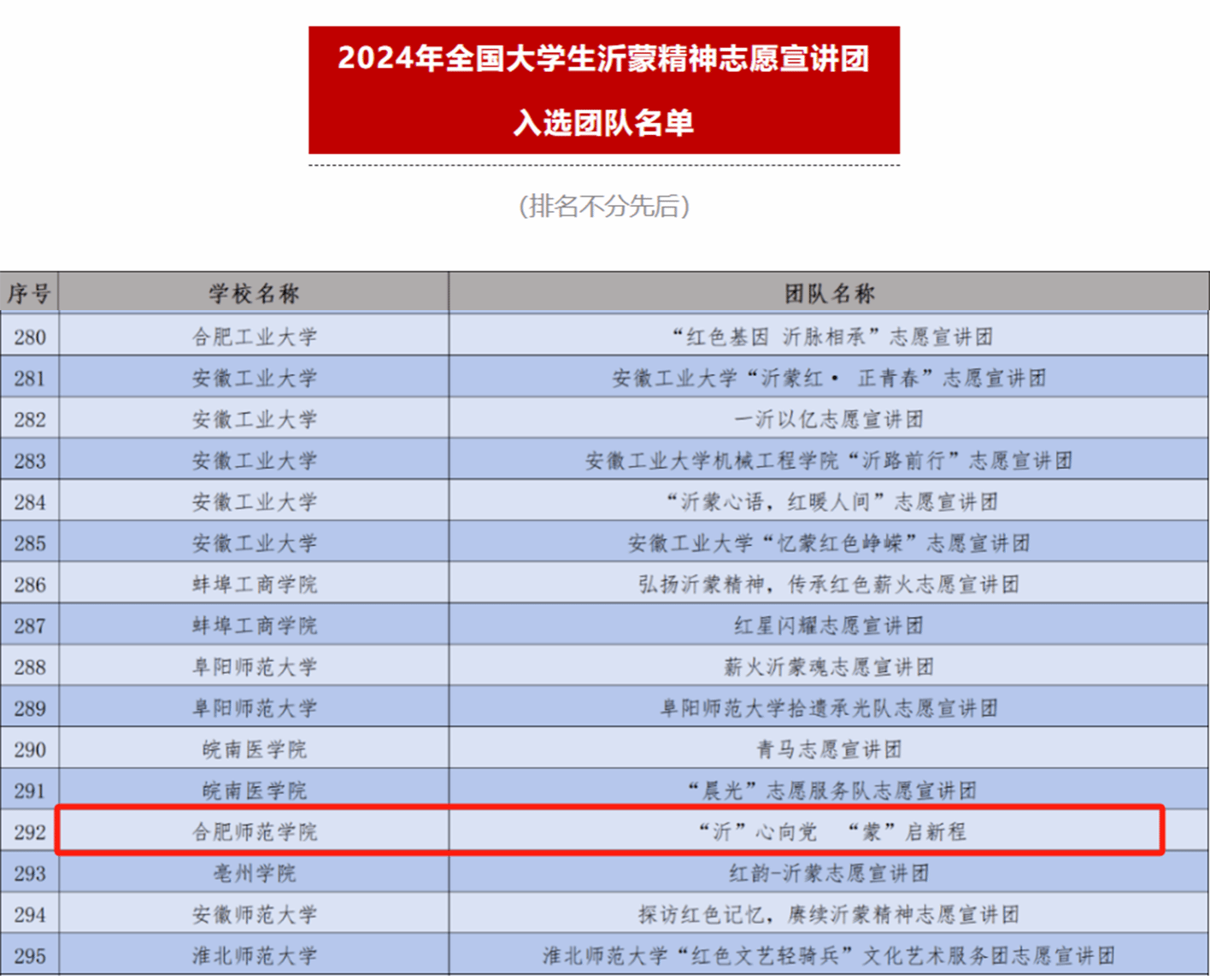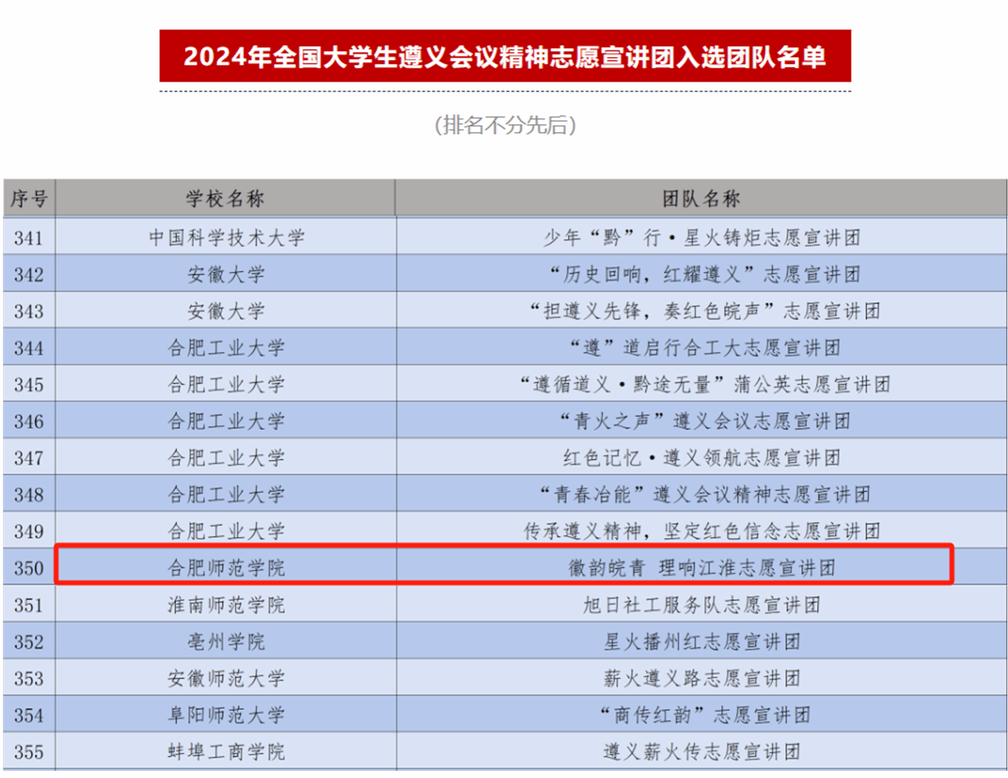 日前,团中央青年志愿者行动指导中心、中共遵义市委、共青团贵州省委共同发布了《关于遴选2024年全国大学生遵义会议精神志愿宣讲团的公告》,团中央青年志愿者行动指导中心、共青团山东省委、中共临沂市委共同发布了《关于遴选2024年全国大学生沂蒙精神志愿宣讲团的公告》。经过激烈的竞争与选拔,其中安徽省共有31支团队入选,beat365英国官网网站2支团队入选,分别是“徽韵皖青 理响江淮”宣讲团(遵义会议精神宣讲团)和“沂”心向党 ‘蒙’启新程”宣讲团(沂蒙精神宣讲团)。两支团队均由beat365英国官网网站2024级网络与新媒体(专升本)1班团支部书记张六军发起,王明蕾老师指导。