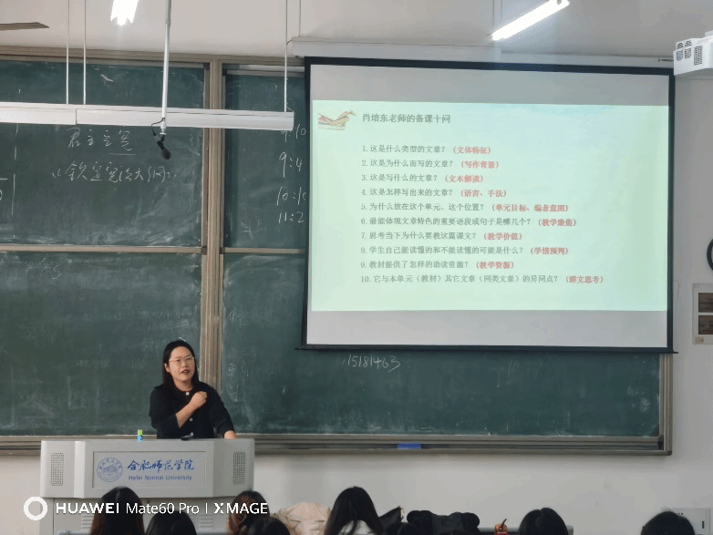 为贯彻师范认证的持续改进理念,推进汉语言文学专业课程建设,12月16日,beat365英国官网网站邀请安徽省教育科学研究院谢发茹老师走进“语文课程与教学论”课堂,为2024级汉语言文学专业师范生讲授“中学语文课堂教学提质路径探索”。