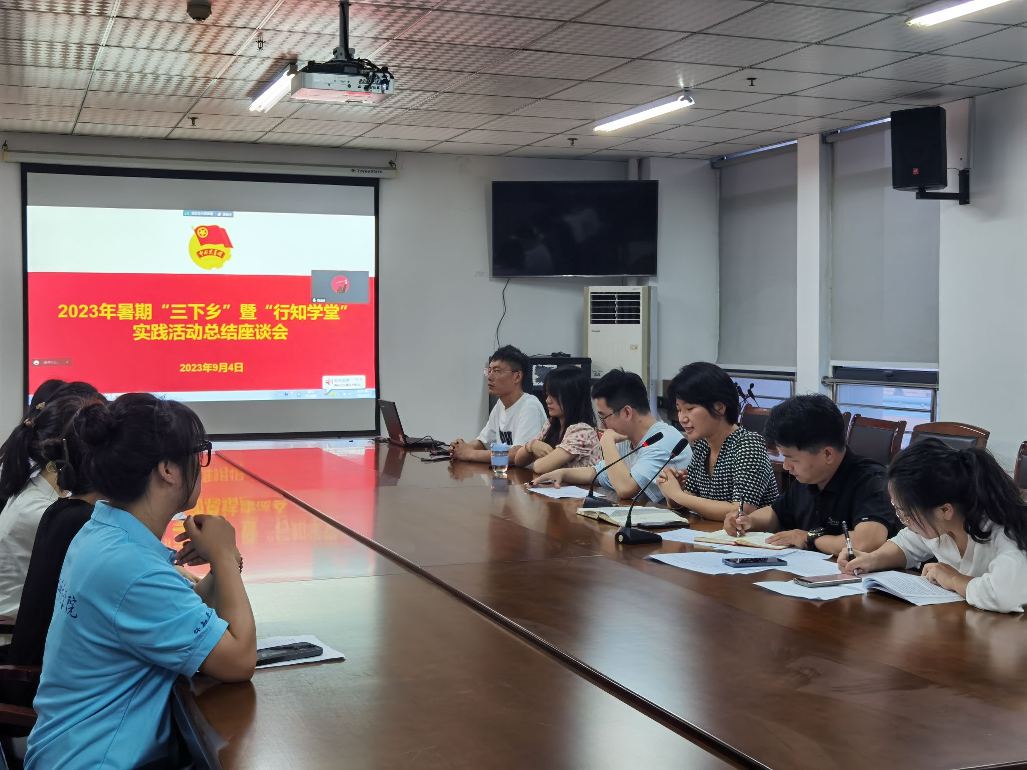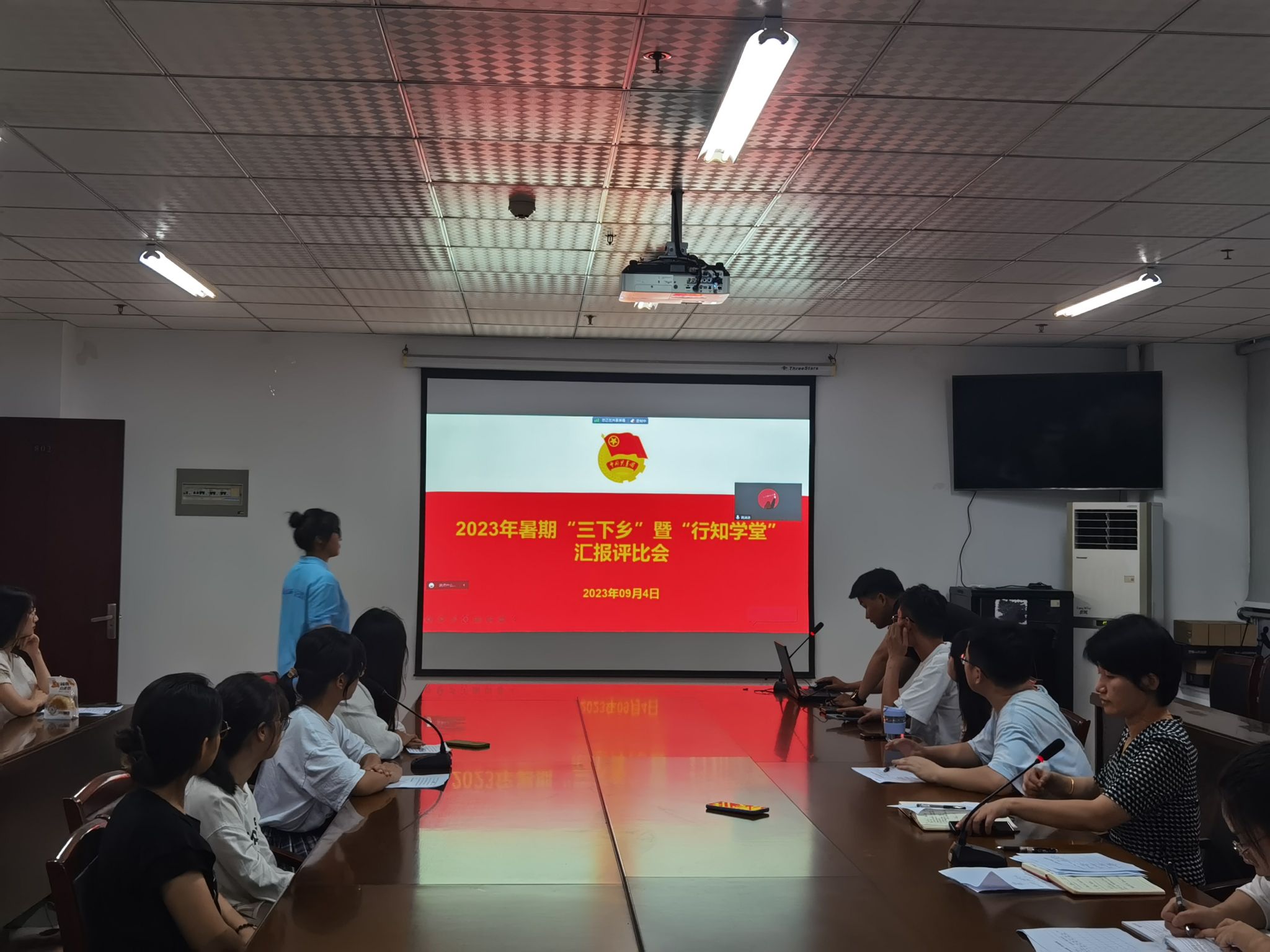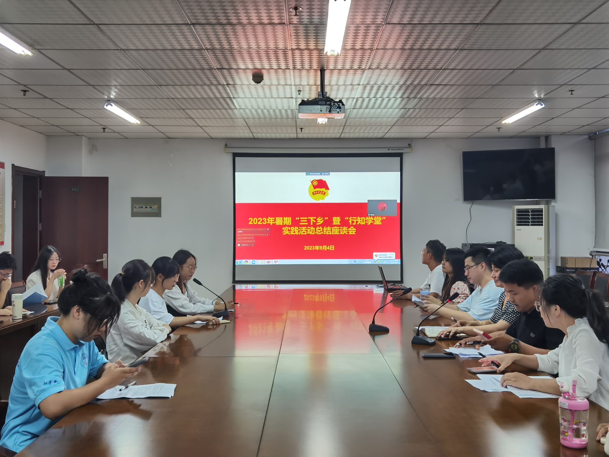 本网讯 为全面落实学校关于2023年大学生暑期“三下乡”暨“行知学堂”社会实践活动部署要求,总结beat365英国官网网站大学生社会实践好经验和典型做法,展现社会实践好活动和示范品牌,9月4日晚,beat365英国官网网站在锦绣校区行知楼802会议室,采取线上线下相结合的方式举行2023年暑期“三下乡”暨“行知学堂”社会实践活动汇报评比会。学院党委副书记夏娟,团委书记李惠恩、副书记疏淑进、辅导员程正、各班级团支部书记及行知学堂负责人代表参加了评比会。
