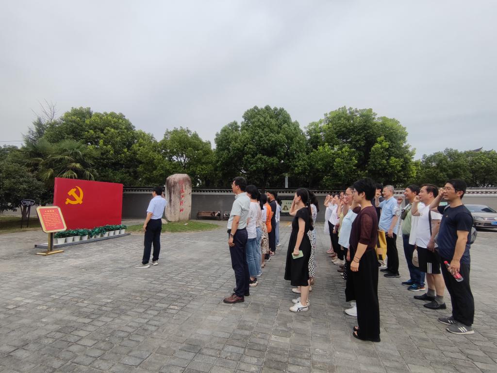 在渡江战役总前委旧址纪念馆前,面对鲜红的中国共产党党旗,全体党员高举右臂、紧握右拳、郑重宣誓,入党誓词铿锵有力、句句千钧,表达了担当作为、奋勇前进的坚定信心。