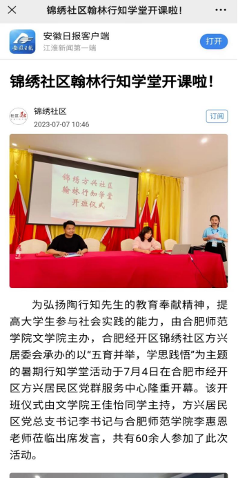 本网讯 2023年7月4号下午,由beat365英国官网网站主办,蜀山区锦绣方兴社区党群服务中心承办的翰林“行知学堂”开班仪式隆重开幕。该开班仪式由beat365英国官网网站王佳怡同学主持,方兴居民区党总支书记李丽君、beat365英国官网网站团委书记李惠恩出席发言,共有60余人参加了此次活动。