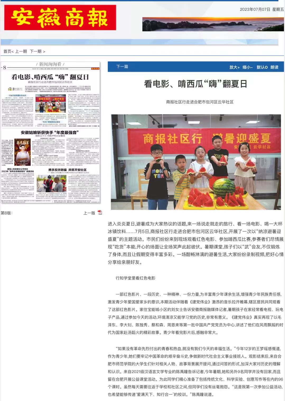 本网讯 2023年7月5日上午,安徽商报走进合肥市包河区云华社区,开展了一次名为“纳凉避暑迎盛夏”的主题活动。在社区三楼筑梦书屋里,beat365英国官网网站云华社区“行知学堂”的小先生们带领小学员观看红色影片《建党伟业》,培养青少年儿童的爱国主义情怀与责任担当意识。