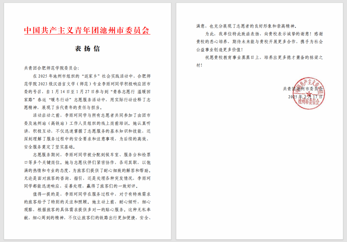 李雨珂积极响应池州市团市委的号召,自1月14日至27日参与到“青春志愿行 温暖回家路”春运“暖冬行动”志愿服务活动中,用实际行动诠释了志愿精神。从活动启动之前线上岗前培训中的认真求知、积极互动,牢记安全注意事项,为后续高效服务奠定基础;到志愿服务期间,在候车室、服务台、检票口等多个人员流动大、难度高的岗位,为旅客们提供了耐心细致的解答和帮助。无论是面对旅客的咨询、指引,还是处理各种突发情况,她都能迅速响应,妥善处理,赢得了旅客们的一致好评。活动结束后,中国共产主义青年团池州市委员会向学校发来表扬信。信中表示,李雨珂以饱满的热情和专业的态度,圆满完成了多项任务,充分展现了志愿者的良好形象和崇高精神。