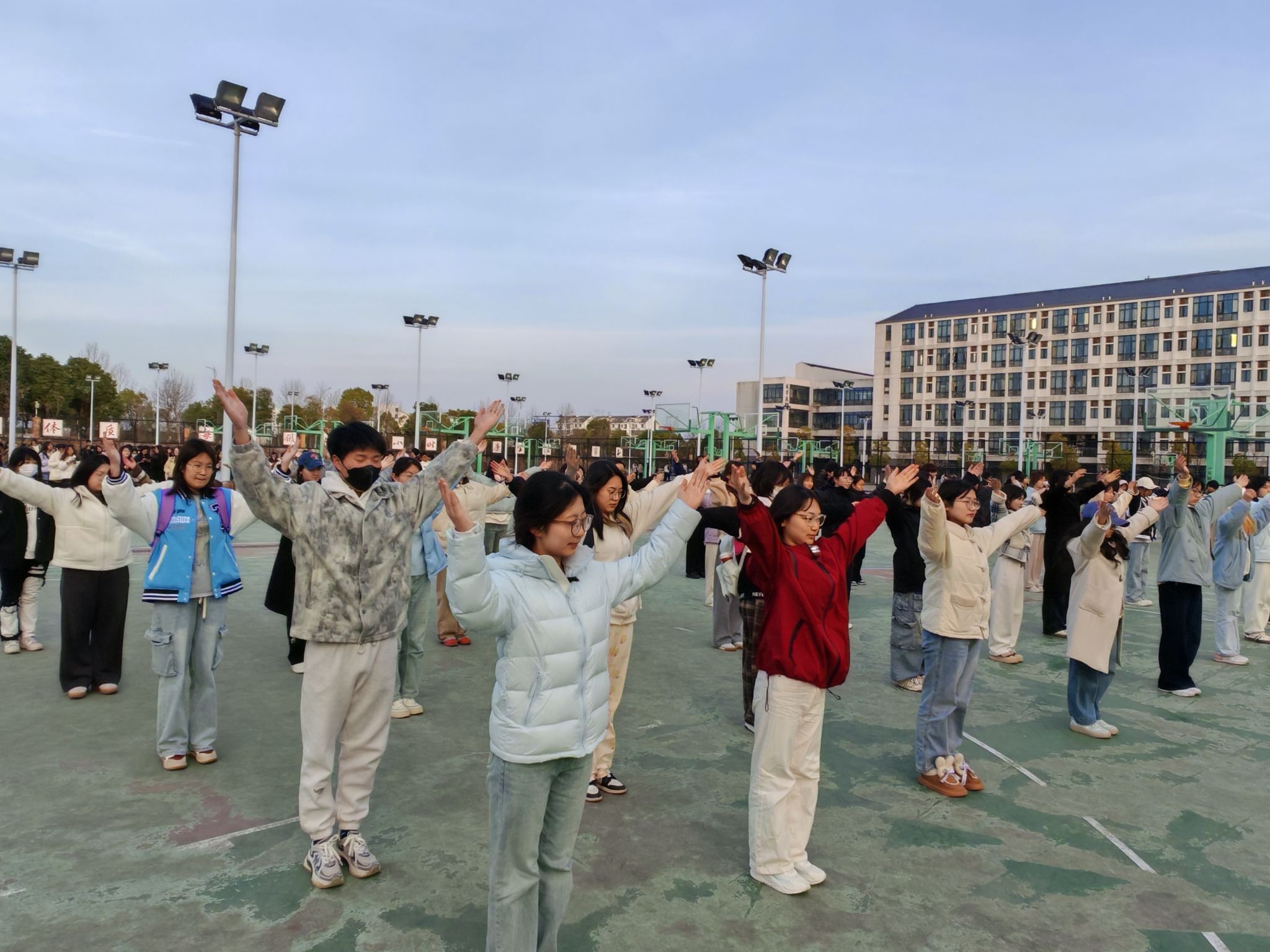 运动场上,各班级广播操方队整齐划一、姿态昂扬,在《中华人民共和国第九套广播体操》的口令下,同学们以饱满的热情进行着充满力量的操练动作,铿锵有力、步伐整齐,展现了青年学生朝气蓬勃、团结向上的精神风貌,为校园增添了一道亮丽的风景线。