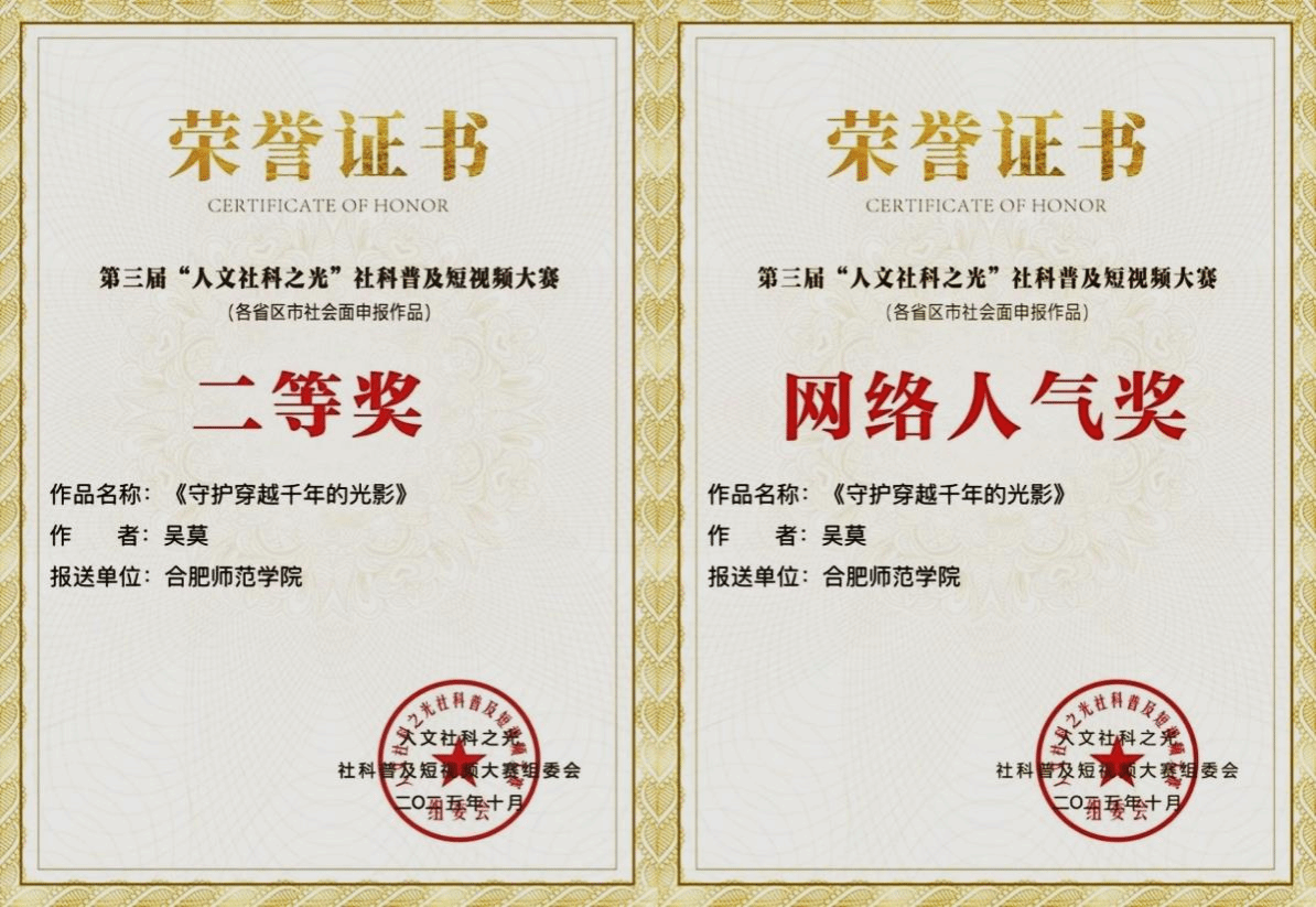 近日,全国第三届“人文社科之光”社科普及短视频大赛圆满落幕,beat365英国官网网站师生创作的《守护穿越千年的光影》(作者:吴莫,指导教师:曹晔华)获大赛二等奖,并获“网络人气奖”。