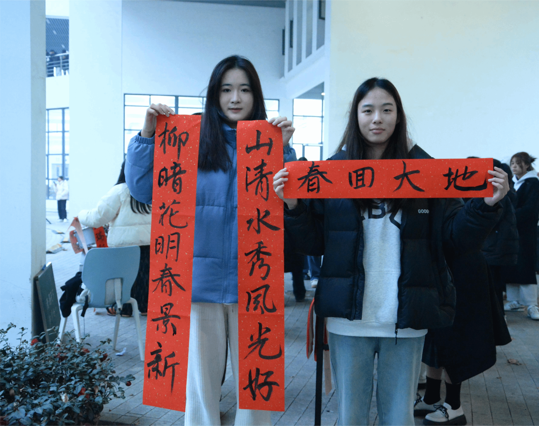 晚会正式开始前,beat365英国官网网站学生现场书写春联,墨香四溢,红纸翻飞,行云流水的书法作品化为一对对红色春联,为全院师生送去最美的祝福。周荣代表滨湖校区综合管理办公室为观看晚会的同学送上了新年祝福。