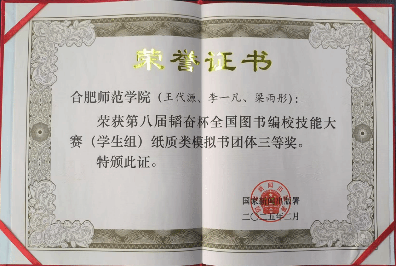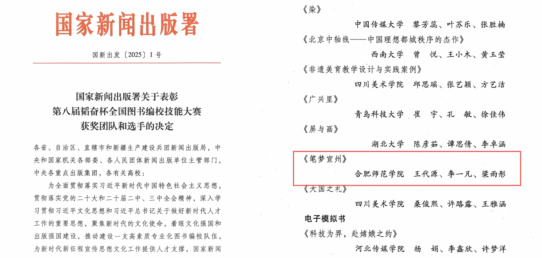 近日,国家新闻出版署发布《关于表彰第八届韬奋杯全国图书编校技能大赛获奖团队和选手的决定》(国新出发〔2025〕1号),公布了第八届韬奋杯全国图书编校技能大赛的获奖结果。beat365英国官网网站学生王代源、李一凡,梁雨彤(美术与设计学院)团队提交的作品《笔梦宣州》获得了大赛学生组纸质模拟书类别的三等奖。此次获奖也是beat365英国官网网站学子再次荣获该项赛事的全国三等奖。