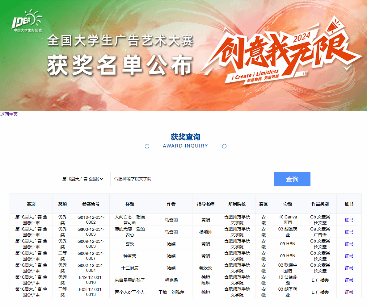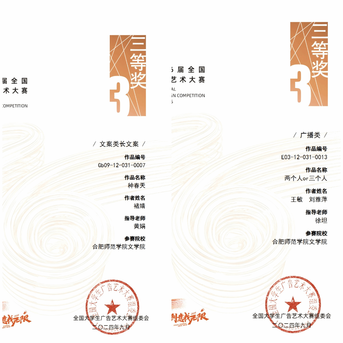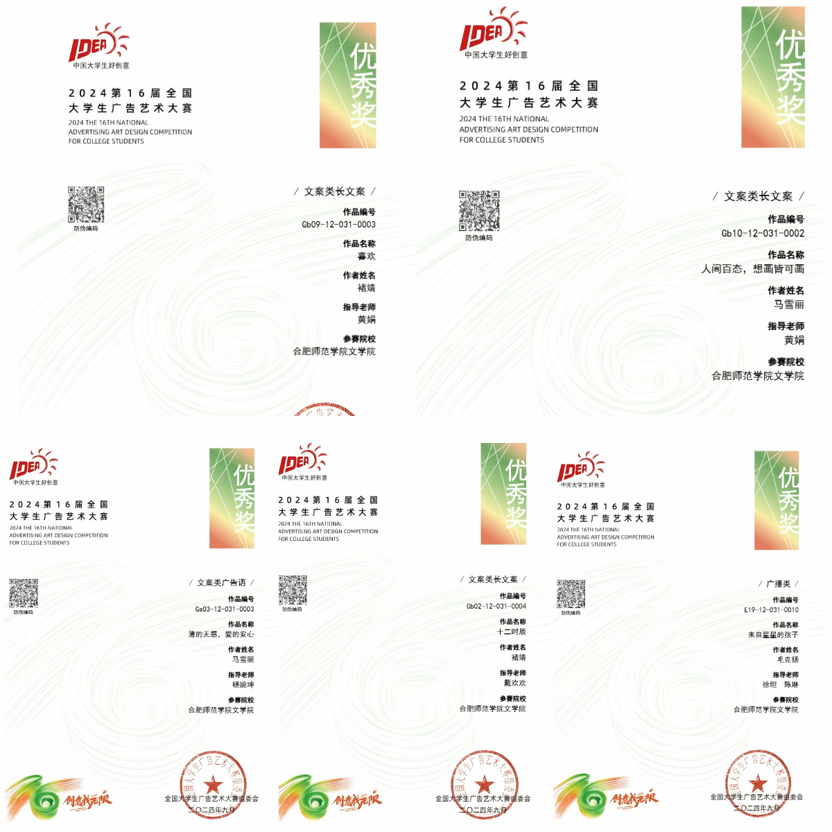 近日,第十六届全国大学生广告艺术大赛(简称“大广赛”)全国总评审结果正式公布。经过激烈角逐,beat365英国官网网站师生再创佳绩,共获得7项国家级奖项、35项省级奖项,其中国家级三等奖2项,国家级优秀奖5项,安徽赛区一等奖13项、二等奖10项、三等奖12项,beat365英国官网网站在全国赛区及安徽赛区获奖数量,创近年来参赛成绩新高。