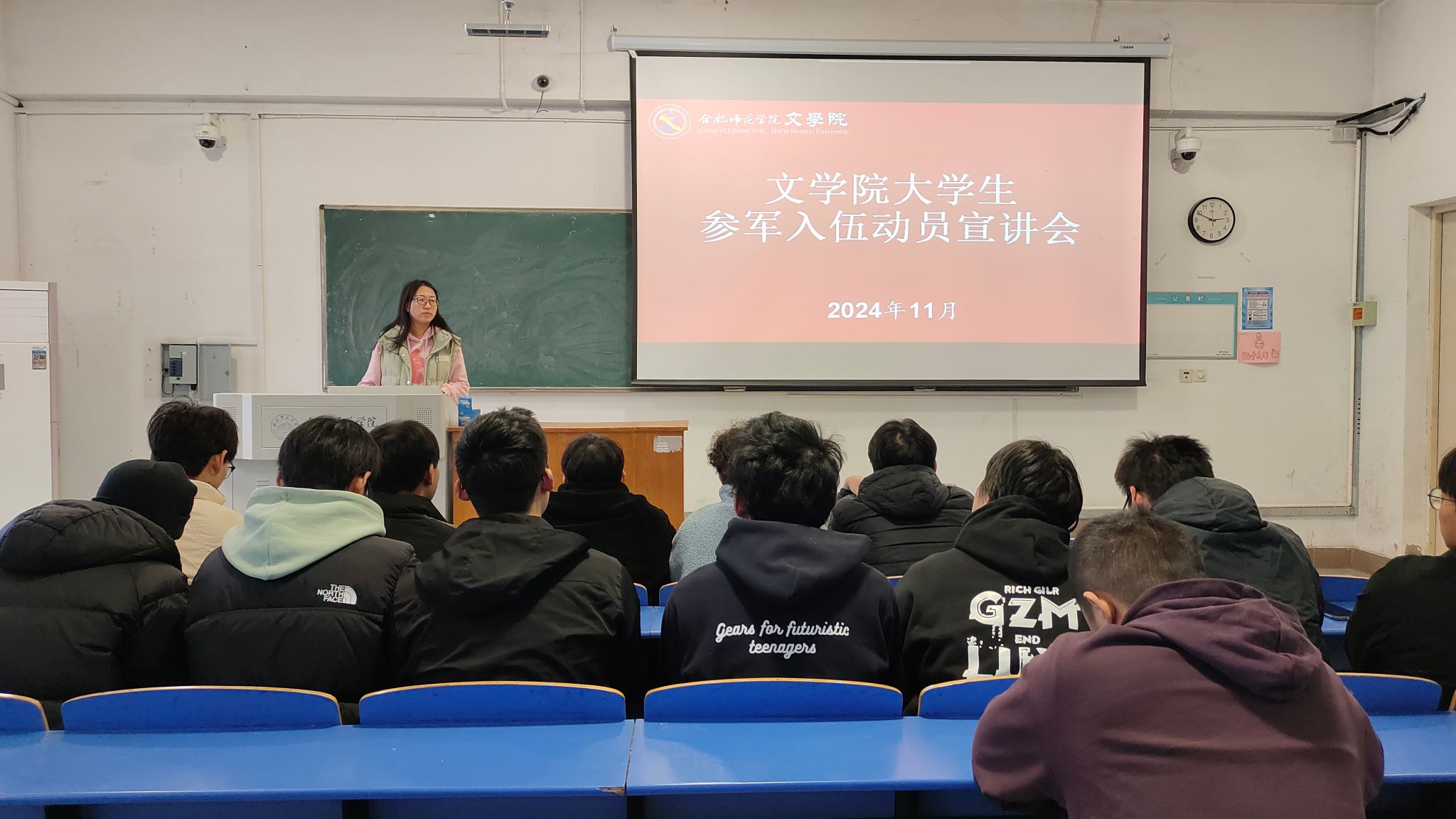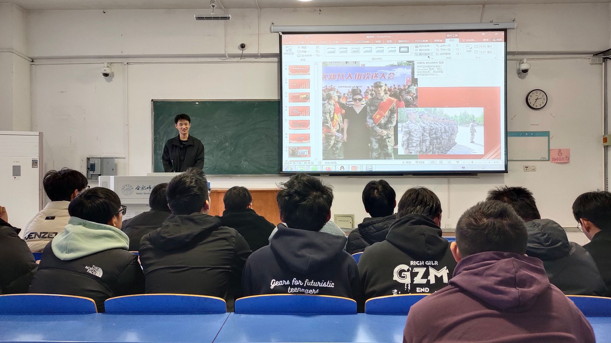 征兵号角响,青春献国防。为深入实施改革强军战略,激发大学生投身国防建设、报效祖国的参军热情。11月27日,beat365英国官网网站在逸夫楼A106举行大学生参军入伍动员宣讲会。beat365英国官网网站优秀退伍复学大学生、2024级网络与新媒体专升本2班潘浩然和仇操操同学作事迹分享。beat365英国官网网站辅导员曹甜甜主持宣讲会。