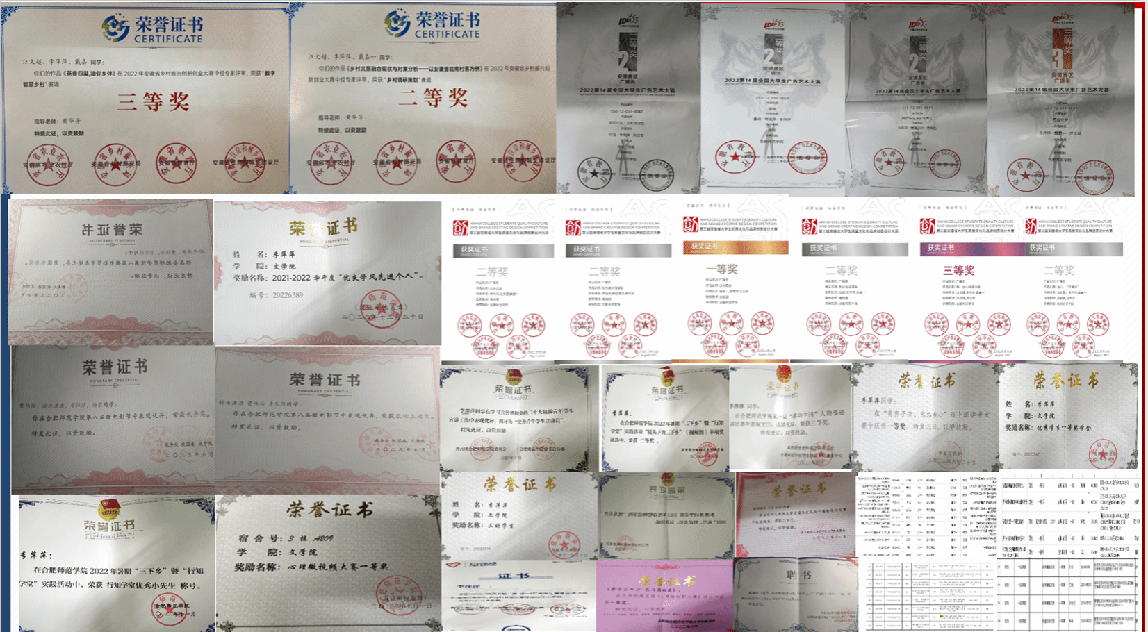 李萍萍,中共党员,beat365英国官网网站网络与新媒体专业2021级学生。连续3年智育成绩、综测成绩排名班级第一,曾获优良学风先进个人,所参与的大创项目获国家级立项;在安徽省“互联网+”创新创业大赛、安徽省大学生广告艺术大赛、安徽省质量文化与品牌创意设计大赛、安徽省乡村振兴创新创业大赛等学科与技能竞赛中获得省级奖项20余项。