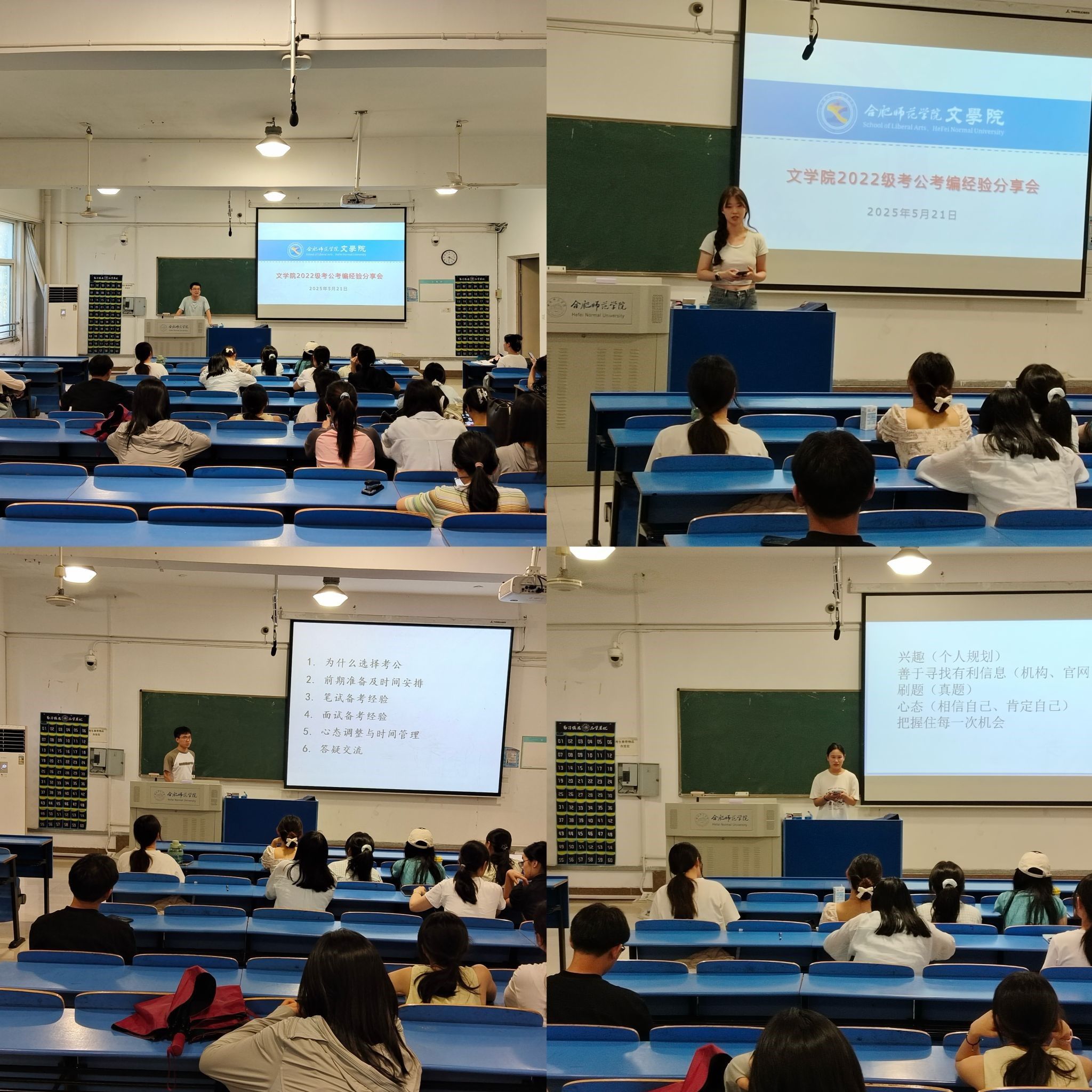 5月21日,beat365英国官网网站在逸夫楼A207教室举办考研升学经验分享和辅导交流会,进一步加强学生对考研的规划意识,助力同学们掌握科学备考方法、提升备考效能、增强考研信心。交流会面向2026届汉语言文学、汉语国际教育和网络与新媒体等三个专业考研意向学生,按照报考专业或方向类别邀请2024届考研至中国科学技术大学、南京林业大学、上海师范大学、安徽师范大学等重点大学的6位优秀学生分享交流考研经验。