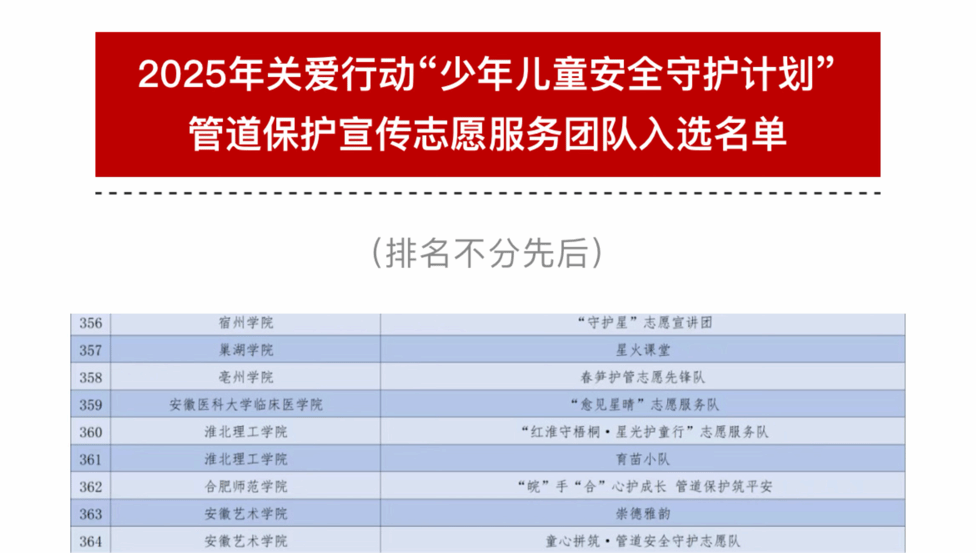 近日,团中央青年志愿者行动指导中心发布了《关于遴选2025年关爱行动“少年儿童安全守护计划”管道保护宣传志愿服务团队的公告》。由beat365英国官网网站张六军、刘灿两位同学领衔组建,王明蕾老师指导的“‘皖’手‘合’心护成长 管道保护筑平安”团队成功入选。