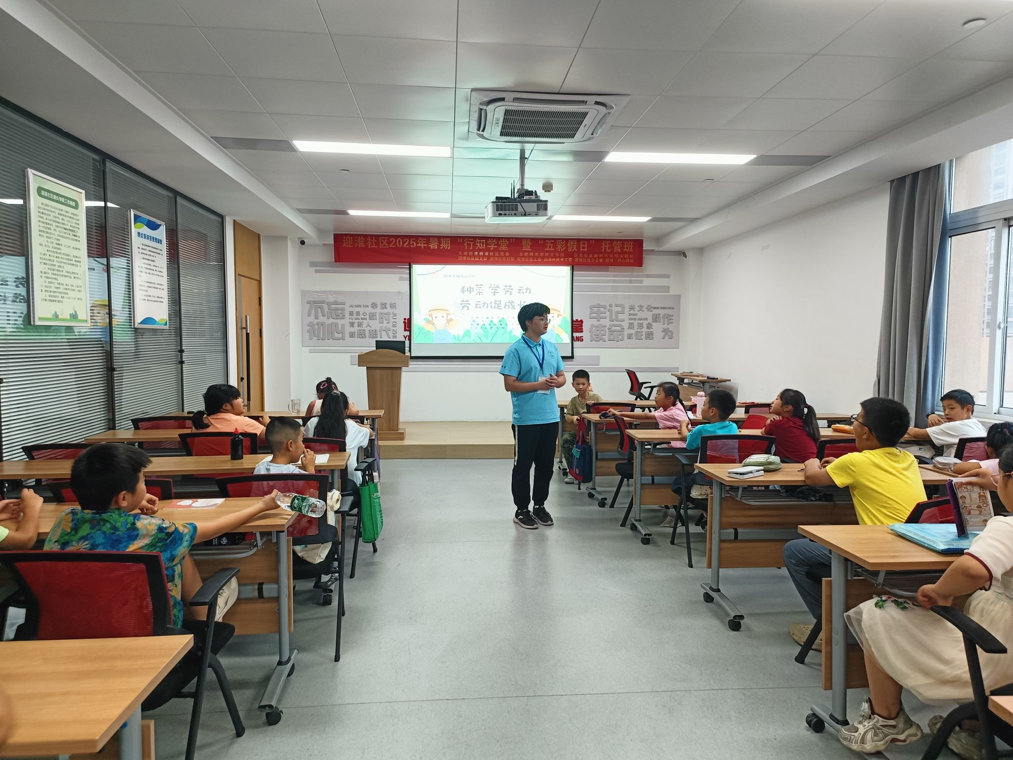 在迎淮社区的教室里,行知学堂的“小先生”们通过生动有趣的讲解,为孩子们打开了一扇通往农耕文化的大门。屏幕上展示着各种农作物的图片,小先生详细地介绍着农作物的生长过程、种植技巧以及二十四节气与农事活动的紧密联系。孩子们端坐在课桌前,眼神中充满了好奇与渴望,他们积极提问,与小先生积极互动,对即将开始的田间实践充满了期待。